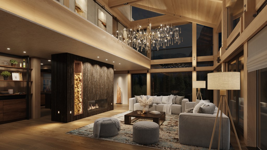 Ah, doesn’t that feel better? Again, we changed none of the architectural features, furnishings, or finishes. It is the exact same room, just under different lighting conditions. When I flip between the two, I see the focus of light move from high over our heads to down into the seating area. I notice soft light in the Comfort Zone from lamps, wall sconces near the windows, accent lighting inside the wood storage, and light on the sculpture near the back. There is even a concealed linear light fixture running the entire length of the beam holding up the second-floor balcony.