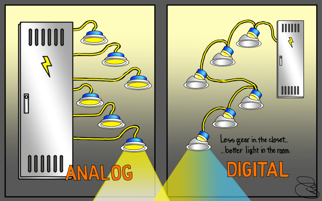 How is that similar to the analog/digital debate? If it were simply a question of putting dollars into dimming cabinets or into fixtures, but the room looked and felt just the same, there might not be a huge advantage to digital systems. Sure, digital systems require less wiring (saving copper, material costs, and labor) and save closet space, but the end result is that the room could look and feel exactly the same. Why bother?