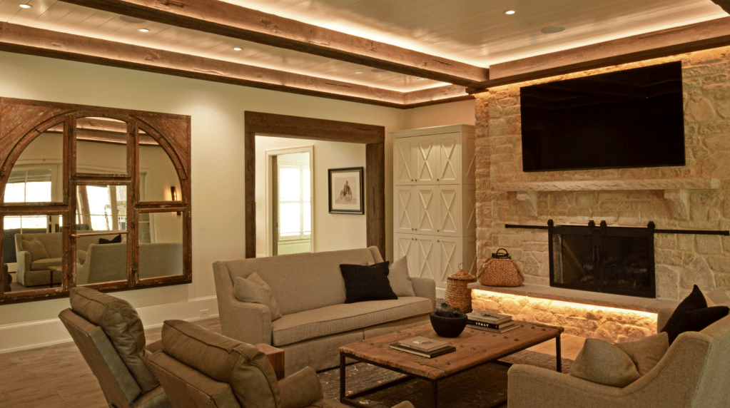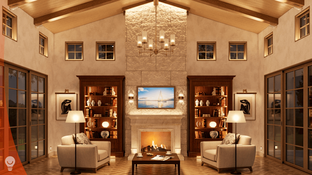 There is no end to opportunities, and we packed a good number of them into this rendering. Notice the up/down sconces on the wooden columns, the light below the coffee table, step/path lights, highlights in the firewood storage, and linear along the bottom of the long wooden beam that holds up the balcony. How many different lighting “layers” can you count in this photo? I count 15.