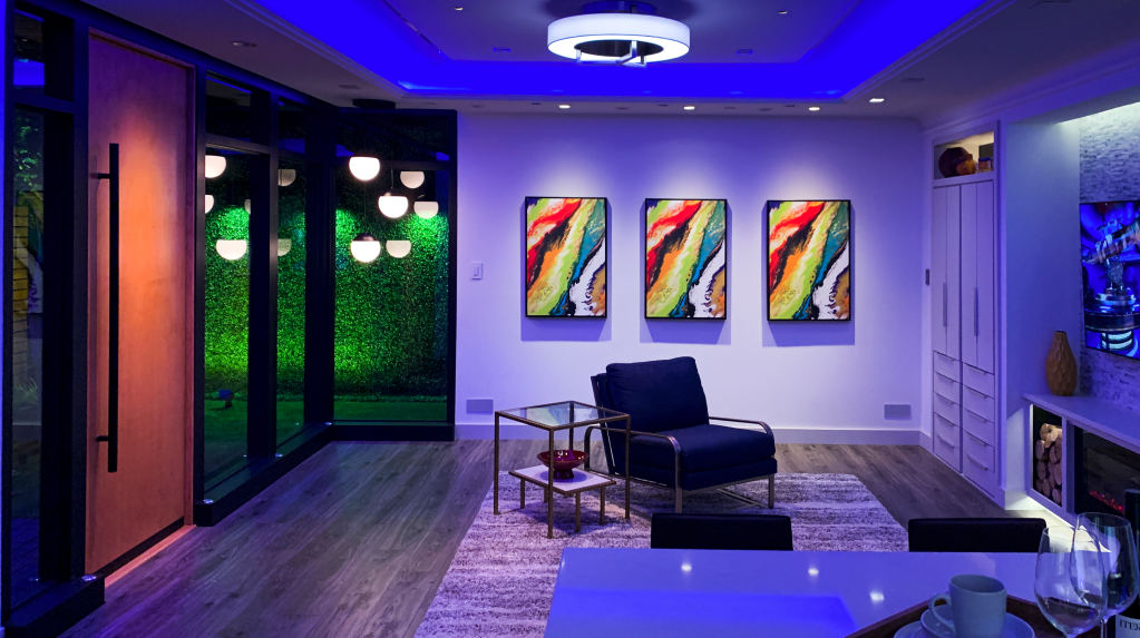 This photograph and the previous both make use of saturated color, another solution that regularly scares our clients. There are some who don’t mind the Las Vegas vibe of dancing rainbows of color, but most of us do not feel a need for party lights. We do like sunsets and magic hour, however, and bringing some of that natural color- like blue skies or amber sunsets- can help us relax and feel comfortable. Dimming is great; adding a little nighttime color takes it one step further.