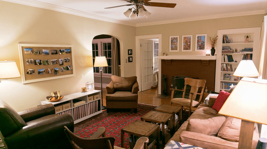 Lighting can get expensive quickly, but a little thrift-store searching or creative upcycling can have a positive impact for just a few dollars. In this simple living room, two accent lamps add sparkle and glow to the Comfort Zone: one on the fireplace mantel and another to the left of the brown chair in the middle of the photo. Both were originally ceiling lighting fixtures that were being thrown out of a family member’s house; adding a cord and plug gave them new life.
