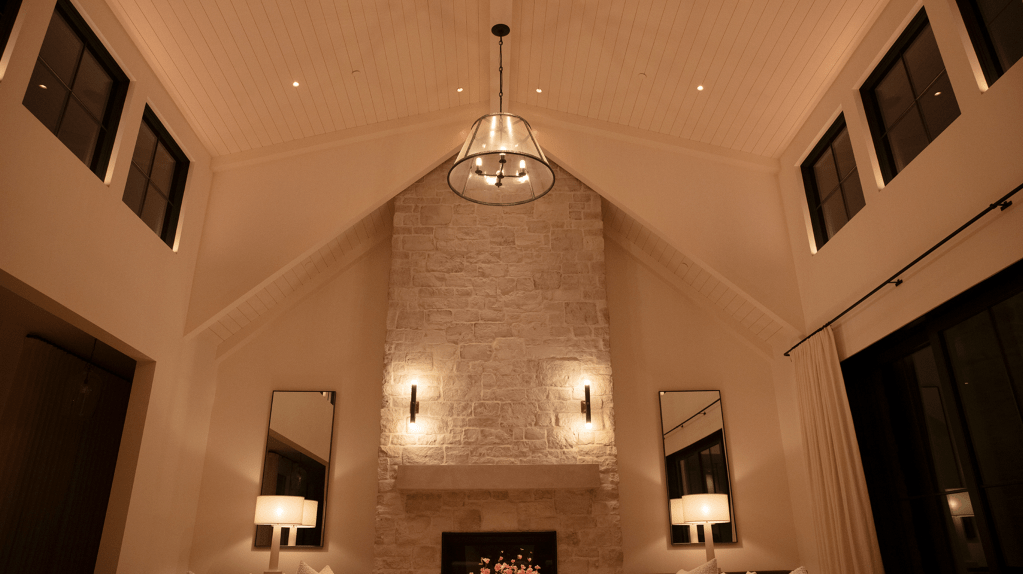 - The Glare Zone has no visible bright recessed downlights and the chandelier is dimmed to just a soft glow. Light is reflected off the ceiling, but nothing points directly at the room’s occupied spaces.