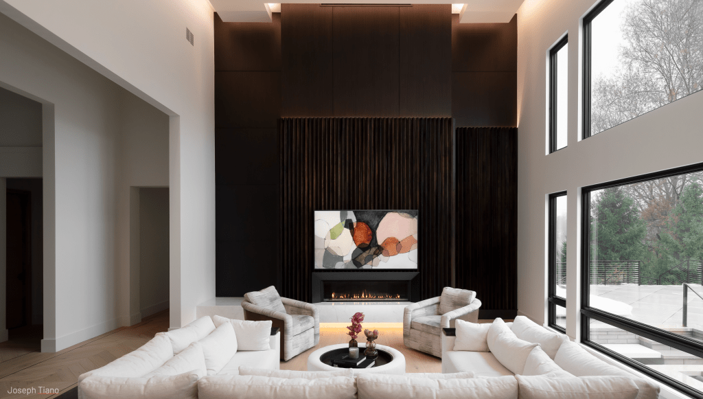 Light in this space is very muted by the daylight flooding in, but you can just make out a linear glow above and to the right of the fireplace where the fluted material steps back to dark wooden panels. This approach helps the interior design treatment look its best while introducing indirect light into the space.