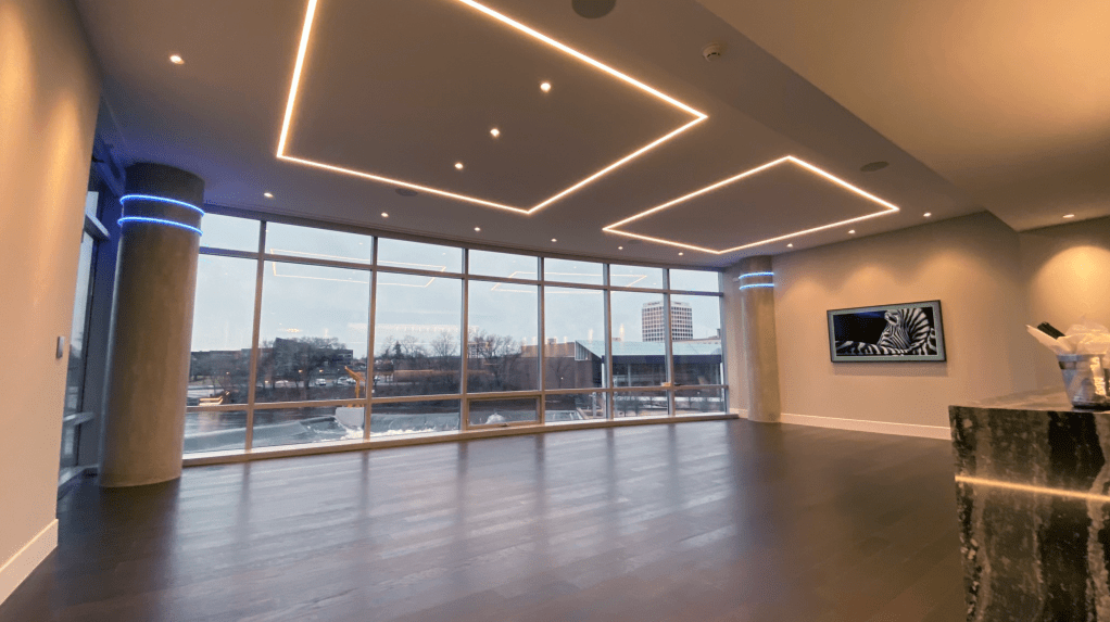 This modern condominium has an open floor plan with a dining area on the left and living area on the right. The lines of light in the ceiling are a bit like area rugs in defining each separate area. Be careful not to rely on these for significant illumination; super bright lines of light can introduce intense glare. Dimmed, however, they make a very nice glow.