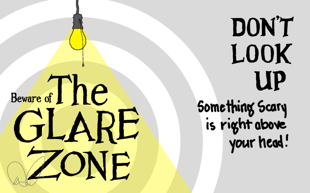 Comfort. Work. Safety. Three of our lighting zones have names that invoke ideas that most of us want: few would say “no comfort, please.” The Glare Zone, however, has a much different ring to it. Perhaps every human eye should come with a READ ME FIRST! warning, every home that has overhead big lights a sign that says, “According to the State of California, overhead lighting has been shown to….”