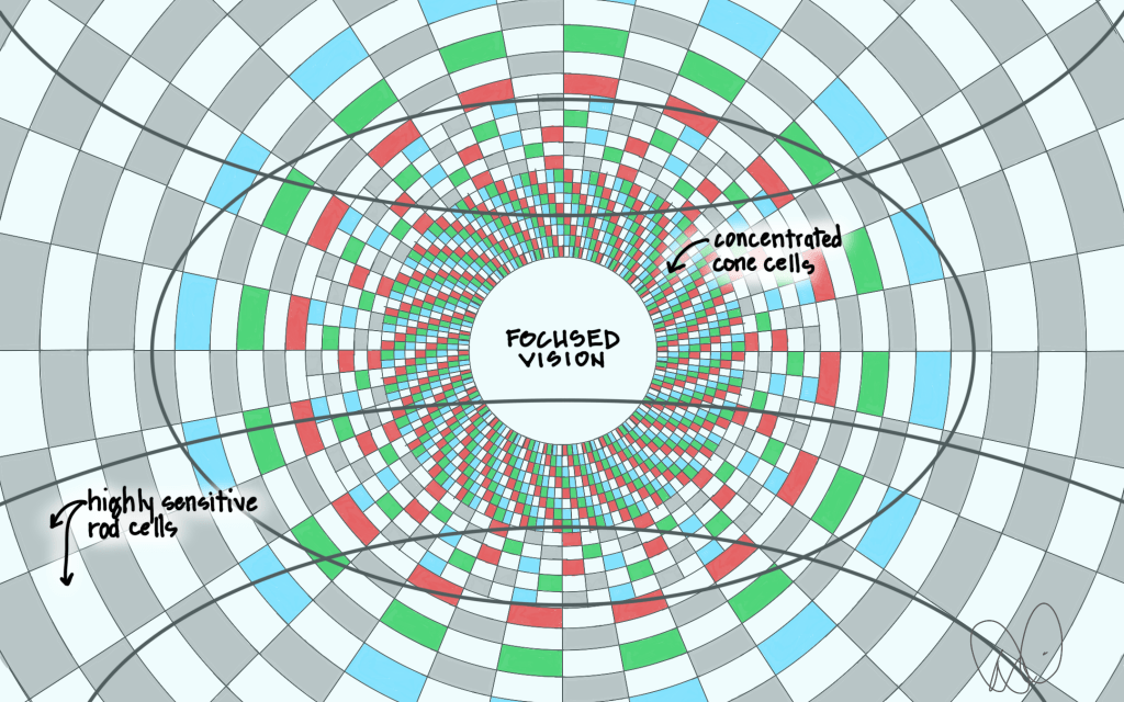 The retina in our eye, the layer of light-sensing cells along the back wall of our eyeball, is hit with focused light that travels through our cornea (lens) and pupil (opening). There are millions of rod cells and cone cells in each retina, each with a purpose. Cone cells, of which there are roughly six million in each eye, are the cells we use to discern color and roughly correspond to red, green, and blue receptors. They are concentrated in our near field of vision and, at the center (technically the fovea, shown above as the white circle labeled “focused vision”) cones are packed so tightly to help us see clearly that there are no rods at all.