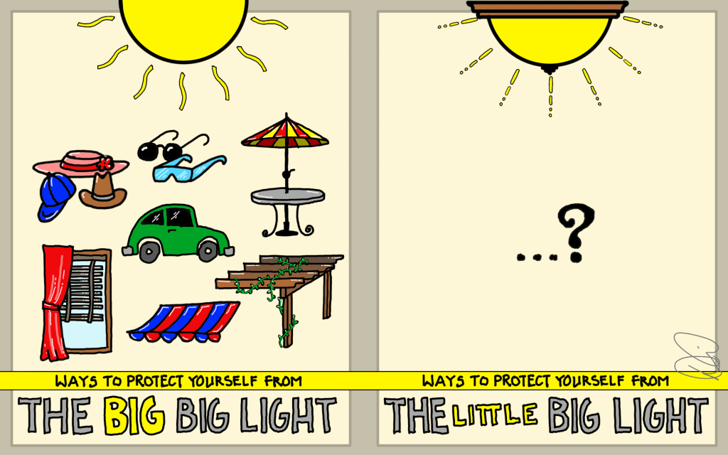 If light can help us wake gently, move with energy, relax easily, and rest deeply, then light can probably hurt us, too. I suspect you know this already: driving westward into the setting sun can hurt, facing bright headlights can temporarily blind the nighttime dog walker. Outside the home there is often little we can do to mitigate the effects, like averting our eyes from the sudden brightness. We cannot predict when a car will approach in the oncoming lane, nor can we reach into the other car and dim their headlights.