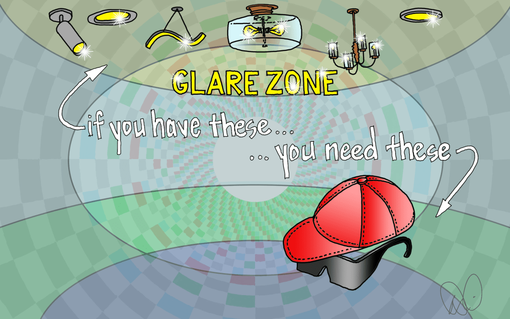 The Glare Zone is shown above in pale yellow and is typically the ceiling of our homes. Technically, the Glare Zone goes all around the perimeter (periphery) of our eyes, but we seldom put chandeliers, downlights, wafer lights, and other Big Lights on the walls or floor. Yes, that would be a problem, but most of the glare in our lives comes from above.