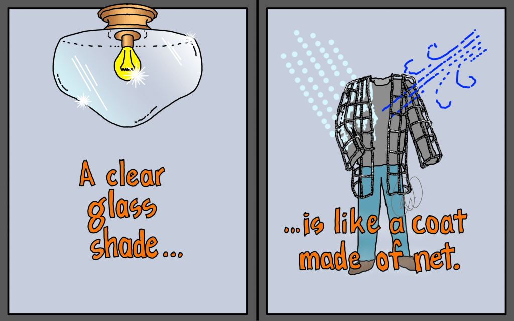 Clear glass does not shade anything. A coat made of net will not protect you from rain or wind, even if it is all the rage on the Paris runway. Light fixtures, especially decorative fixtures like chandeliers and wall sconces, are subject to the fickle nature of fashion. Don’t be fooled.